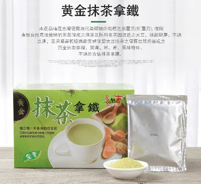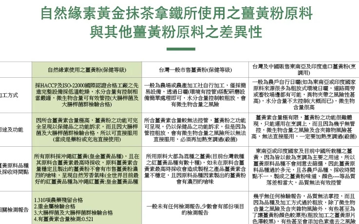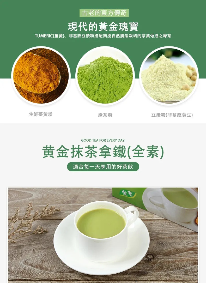本產品採100%精選台灣優質無污染環境所栽種之秋薑黃(紅薑黃), 採收季節一定堅持讓薑黃達到最佳熟度的季節採收,將薑黃全株塊根採現代化機器低溫乾燥方式,讓全株薑黃塊根等有效成分能有效保留,搭配南投自然農法栽培的茶葉做成之綠茶及採用非基因改造之大豆,超細研磨、不濾豆渣,並採噴霧乾燥而能完整保留大豆精華之優質豆漿粉製成之黃金抹茶拿鐵,質濃、純、香,風味特殊,絕不遜於市售抹茶拿鐵,適合銀髮族、素食者、加班、夜貓族宵夜、成長中學童及青少年、忙碌上班族的早餐、午茶、營養代餐及全家人隨時飲用。
