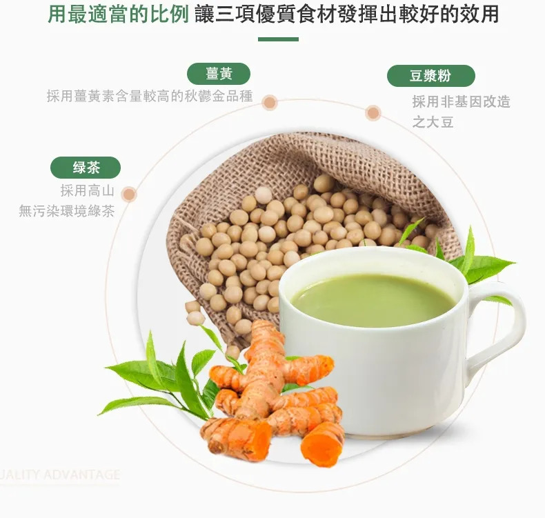 7.本商品以紅薑黃搭配優質綠茶粉及非基改豆漿粉,採最適當之比例能讓該三項優質食材發揮出最大的效用。