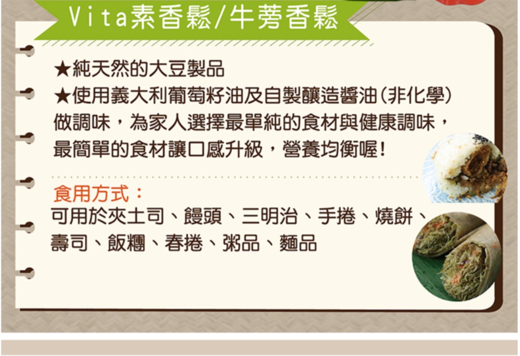 1.使用義大利恬沛葡萄籽油製作, 2.純天然大豆製品,素食者也可享用香味四溢的美食, 3.無香料、無人工色素、無添加其他添加物, 4.可用於夾土司、饅頭、三明治、粥品