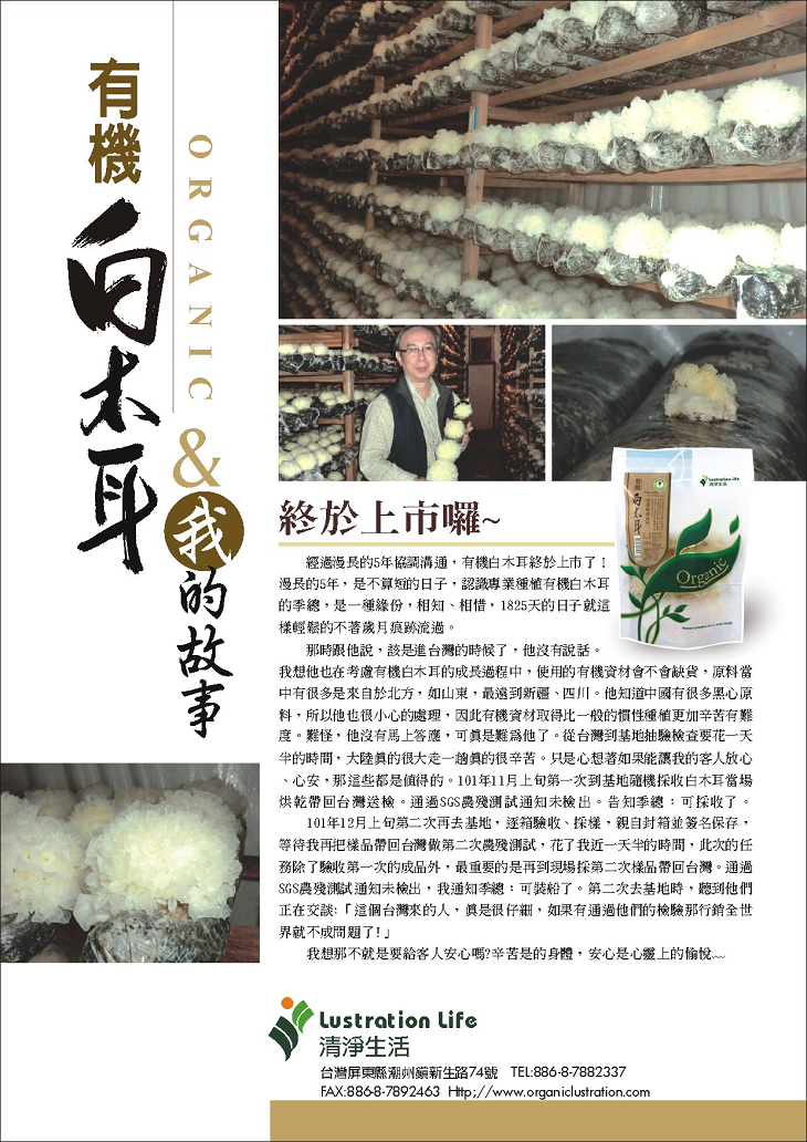 清淨生活的有機白木耳,有著淡淡獨特白木耳清香,是市售所沒有的,純天然沒有防腐劑及二氧化硫,並經SGS檢驗無農藥殘留及重金屬合法國家標示,為您的健康把關,敬請安心食用。現在有很多人主張用白木耳取代昂貴的燕窩來補充膠質保養身體,其料理時通常用以甜或鹹湯配料,例如冰糖蓮子、紅棗銀耳蓮子湯等,入口滑順,口感鮮脆,是自然又健康的美味佳餚。