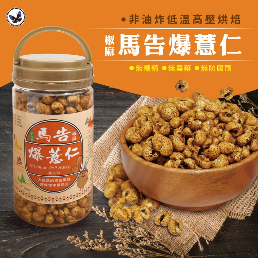 紅薏仁、焦糖、黑糖、棕櫚油(非氫化植物油)、樹薯澱粉、鹽、辣椒粉、胡椒粉、馬告