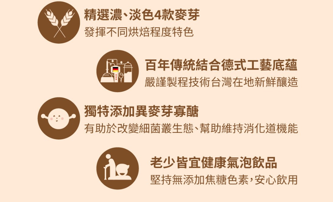 1.遵循本公司黑麥汁系列產品製程,精選不同烘培程度的濃、淡色4種麥芽配方,並結合德式工藝精神釀製而成,經酵母淺度發酵,轉換提升麥汁中營養成分。