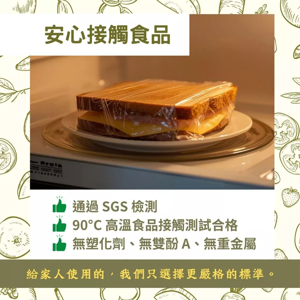 保證不含塑化劑、不含氯,耐受 100度C高溫。加熱剩菜、包裹油脂食物完全放心,是您最堅實的食安屏障。