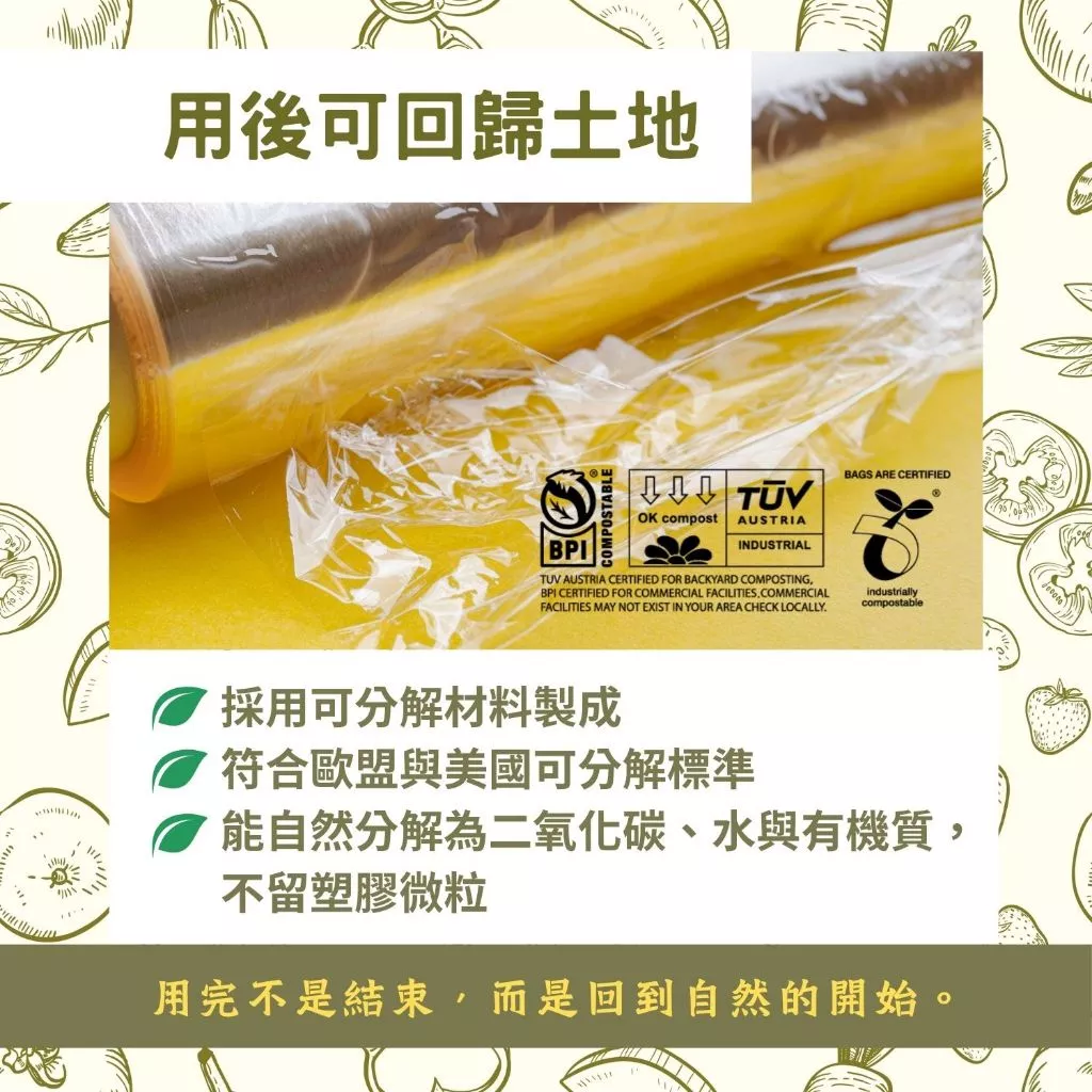 採用高級 PBAT 酯聚合物,它會隨著時間回歸自然循環,避免產生危害海洋與土地的塑膠微粒。