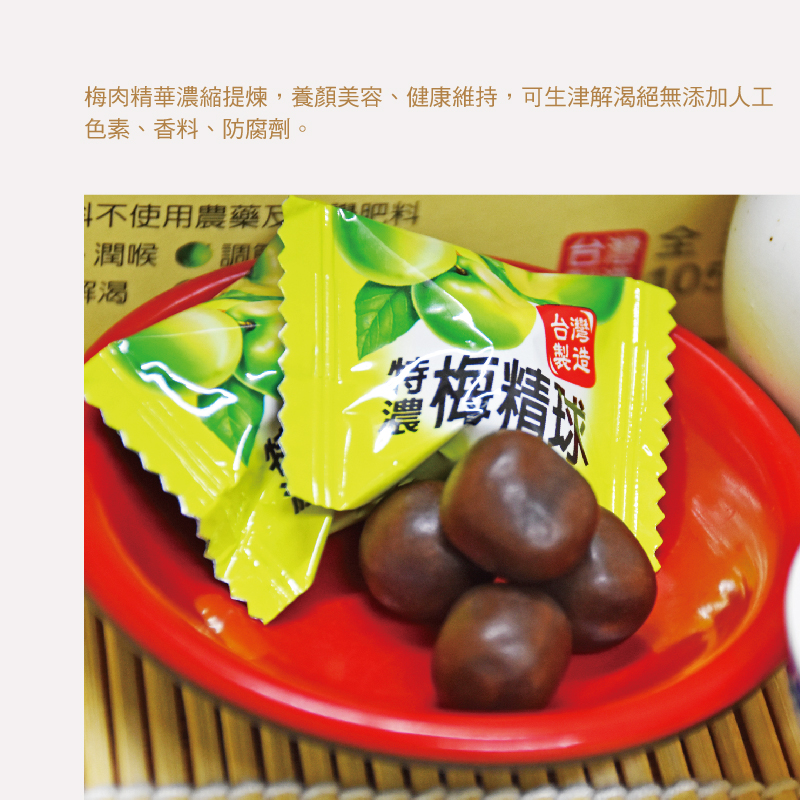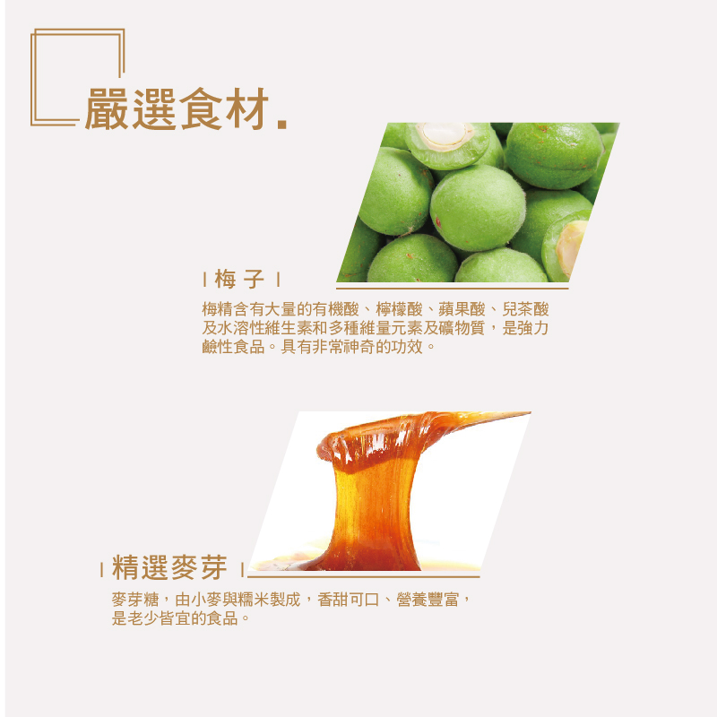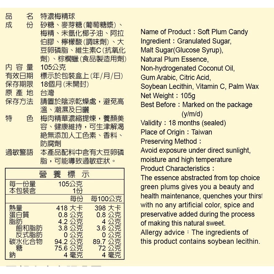 砂糖、麥芽糖(葡萄糖漿)、梅精、未氫化椰子油、阿拉伯膠、檸檬酸(調味劑)、大豆卵磷脂、維生素C(抗氧化劑)、棕櫚蠟(食品製造用劑)