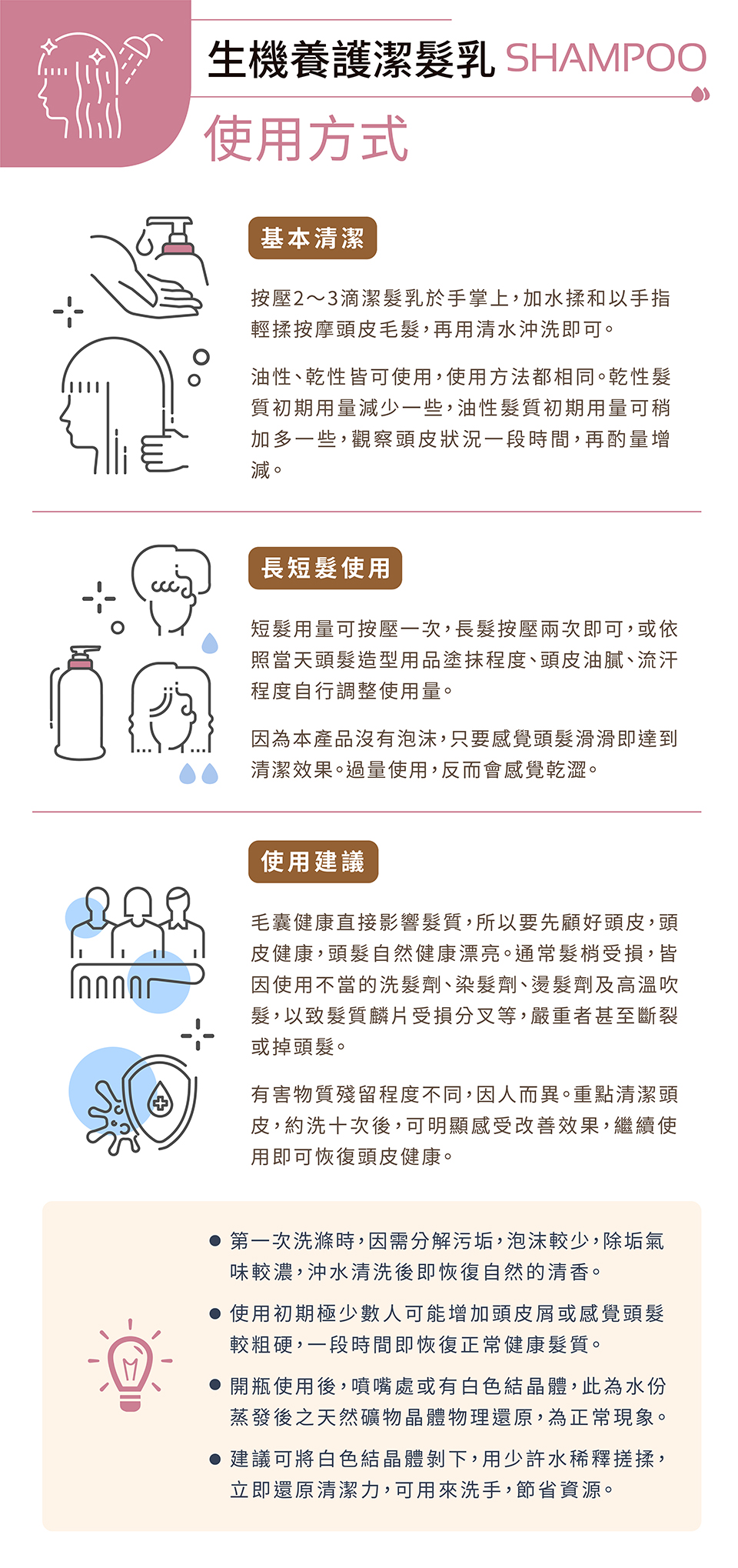 2. 使用初期極少數人可能增加頭皮屑或感覺頭髮較粗硬,一段時間即恢復正常健康髮質。