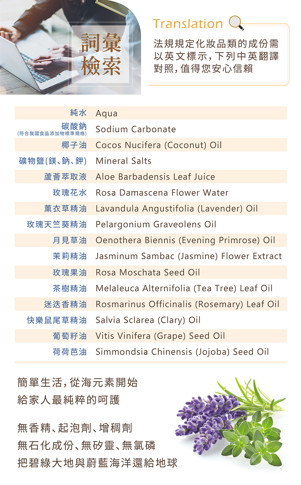 成 份:Aqua、Sodium Carbonate、Cocos Nucifera (Coconut) Oil、Mineral Salts、Aloe Barbadensis Leaf Juice、Melaleuca Alternifolia (Tea Tree) Leaf Oil、Rosmarinus Officinalis (Rosemary) Leaf Oil、Salvia Sclarea (Clary) Oil、Vitis Vinifera (Grape) Seed Oil、Simmondsia Chinensis (Jojoba) Seed Oil
