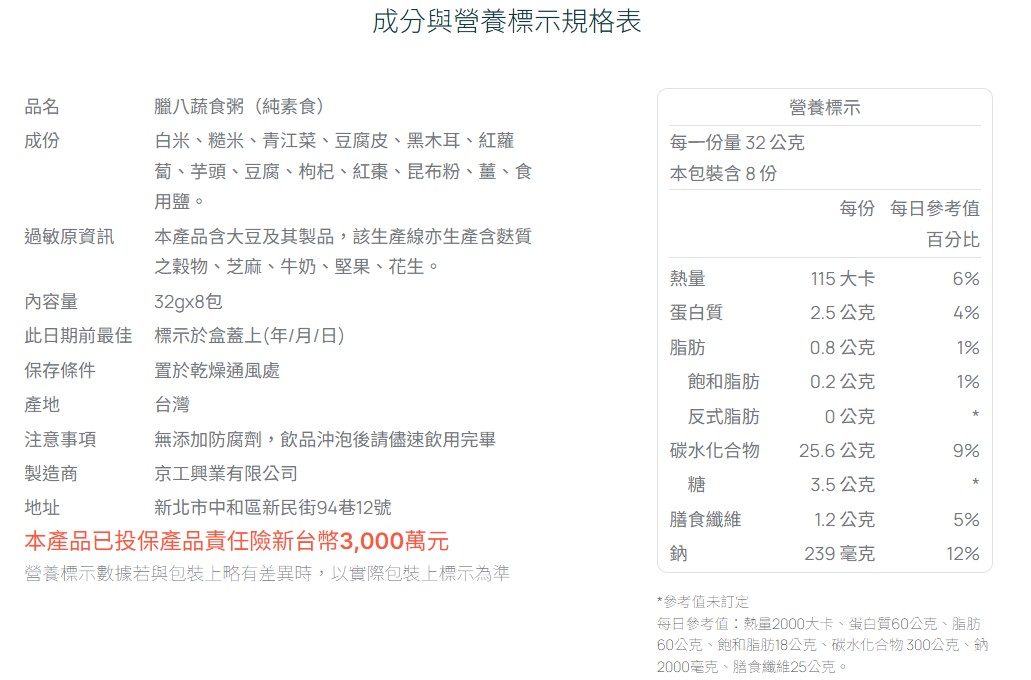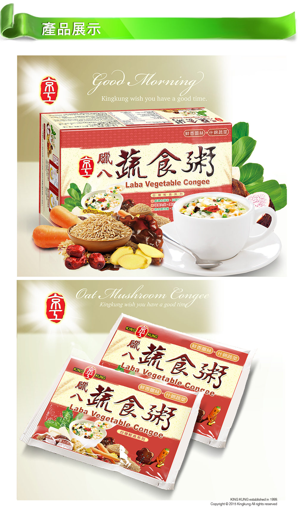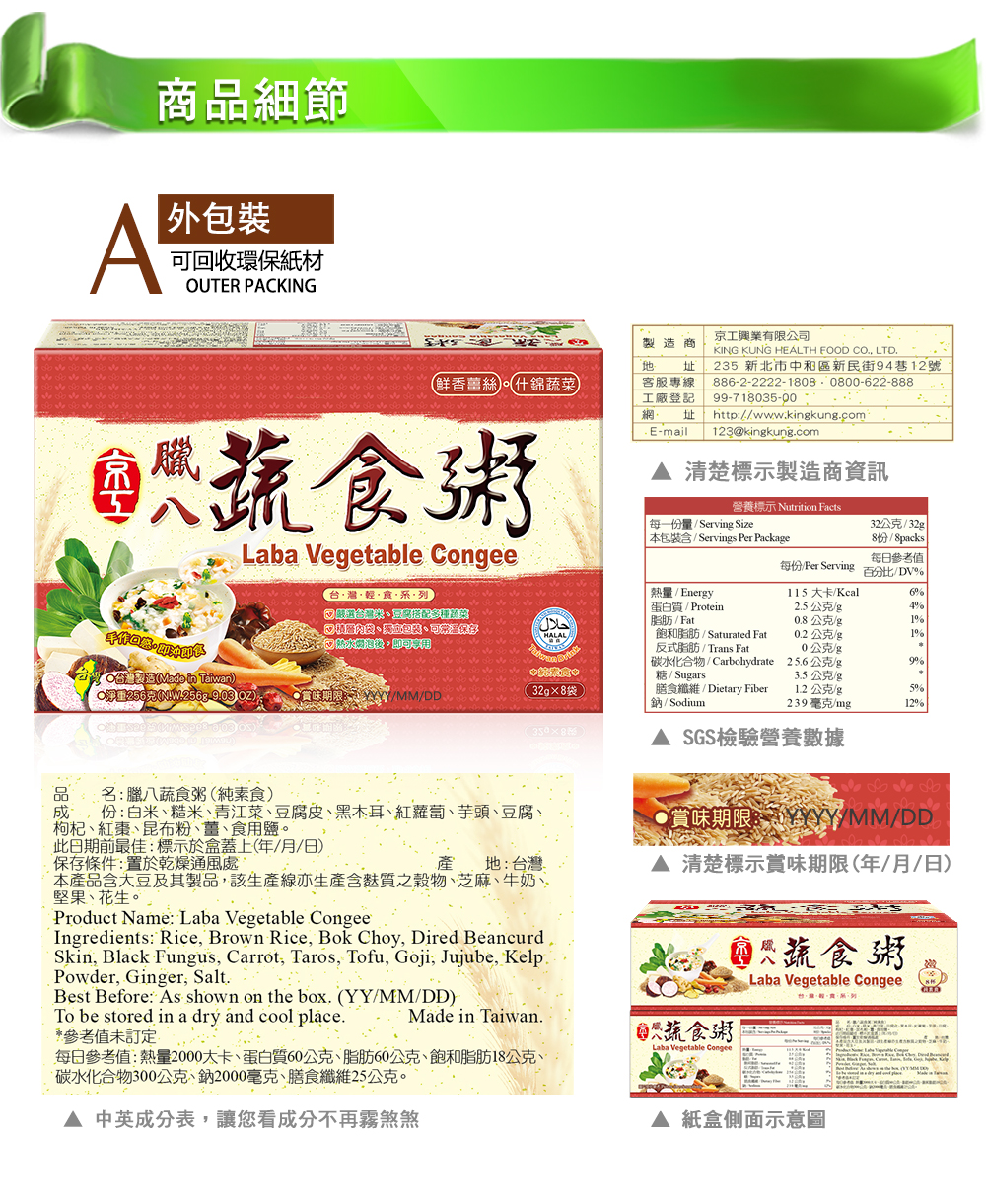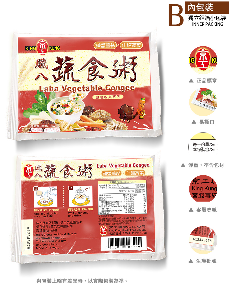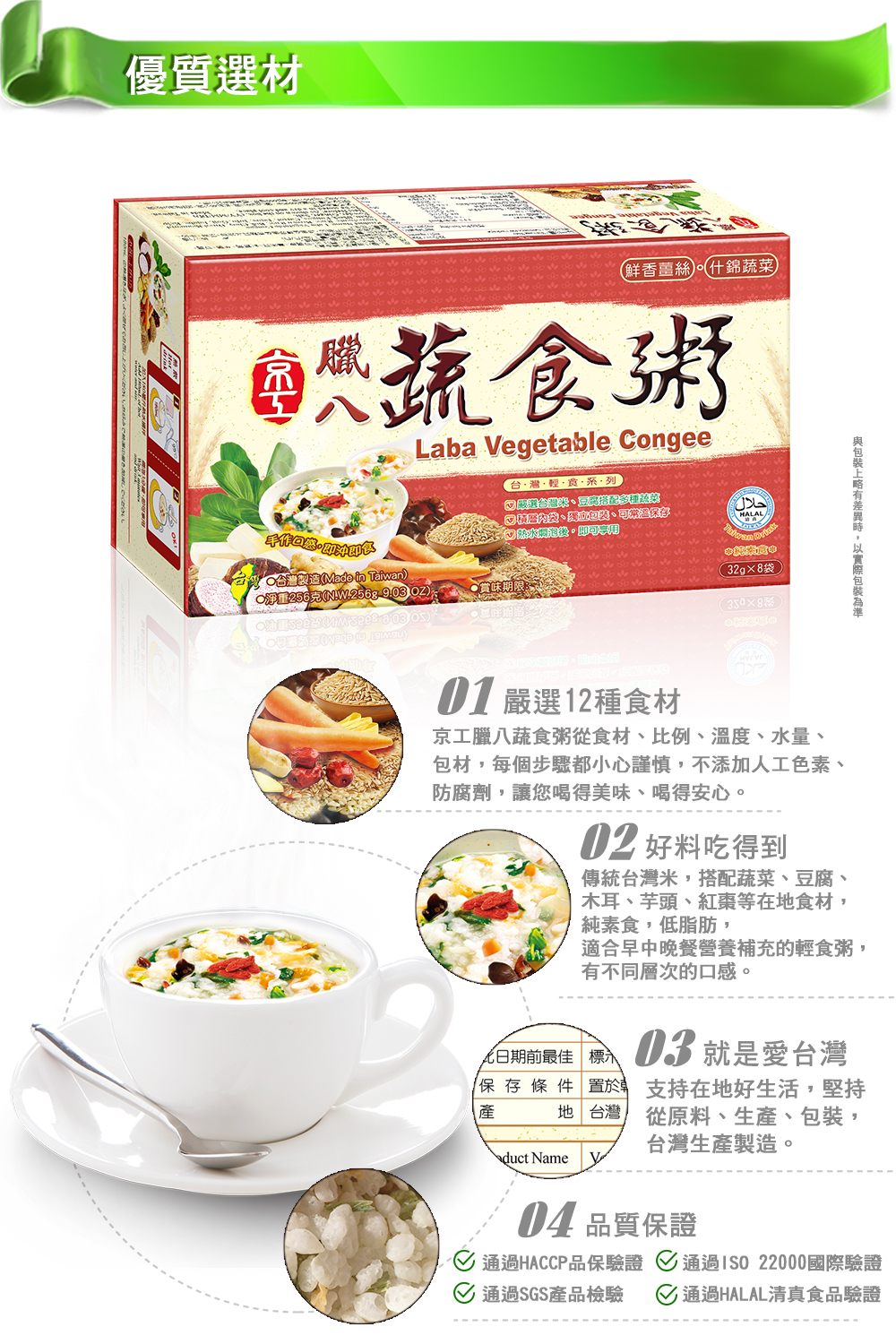 嚴選台灣糙米,搭配蔬菜、豆腐、木耳、芋頭、紅棗等在地食材,純素食,低脂肪,適合早中晚餐營養補充的輕食粥,沖泡後鮮香可口,有不同層次口感。