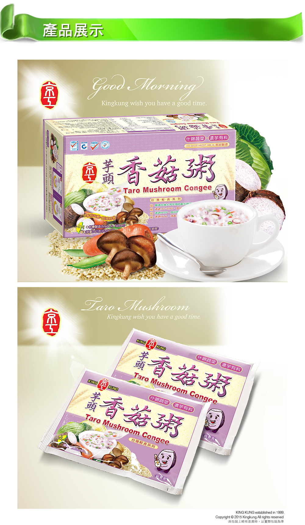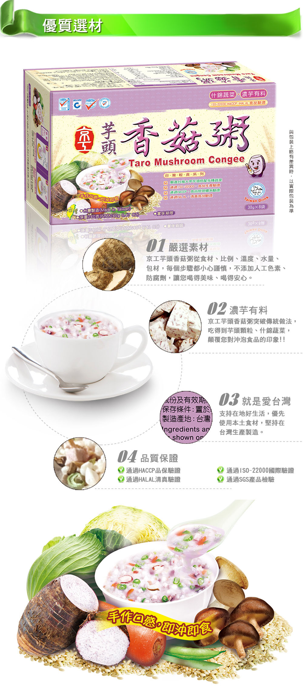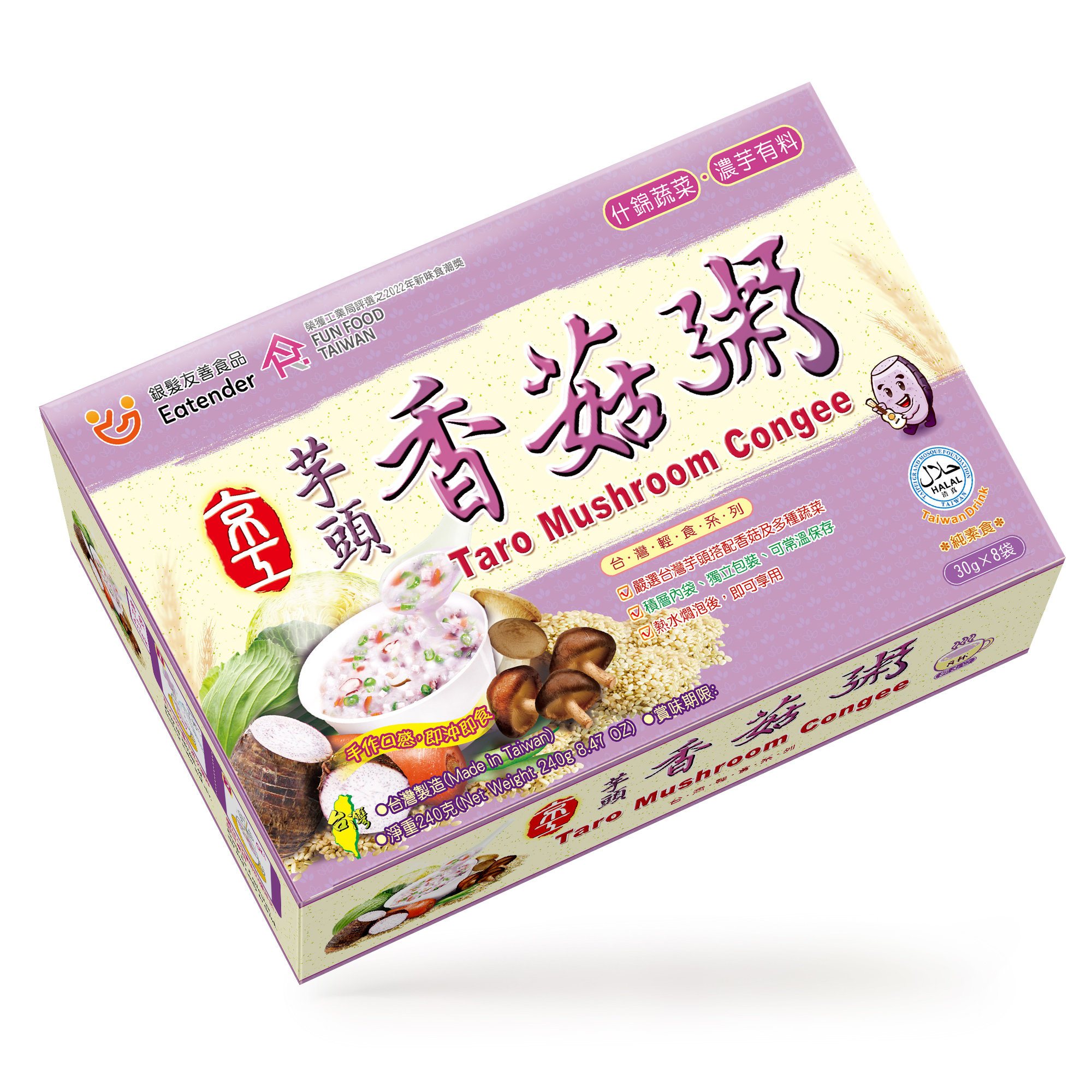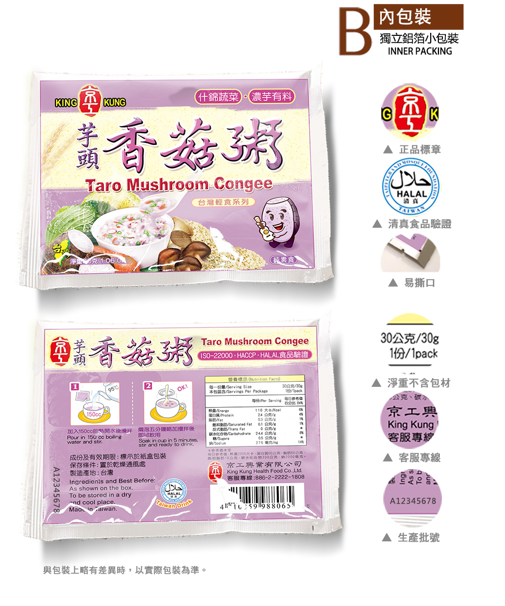 嚴選大甲芋頭、香菇搭配什錦蔬菜、糙米,製成台灣傳統芋頭粥品,沖泡後散發出芋頭韻味,入口鬆軟香甜,搭配杏鮑菇及高麗菜增加Q勁及脆度的層次的口感,表現台灣傳統芋頭粥品的文化特色。